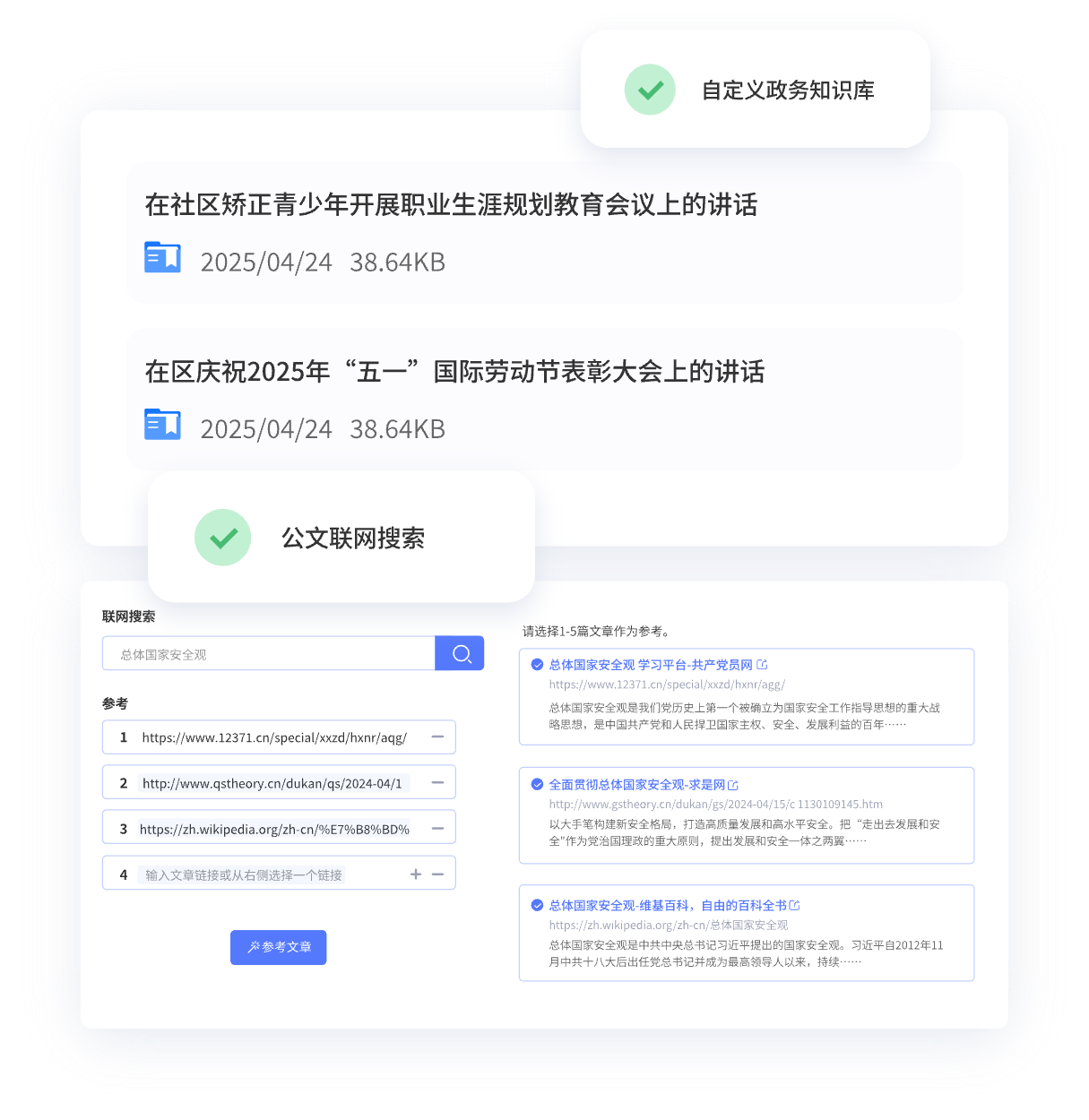 上傳政務(wù)或個人寫作常用材料,用于精準(zhǔn)生成符合自己寫作風(fēng)格的公文